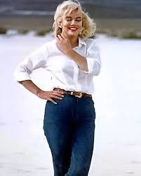 While male actors made jeans rebellious, female stars like Marilyn Monroe showed that women could wear them too. Monroe appeared in Western films and publicity photos wearing fitted jeans, challenging traditional ideas about women's clothing.