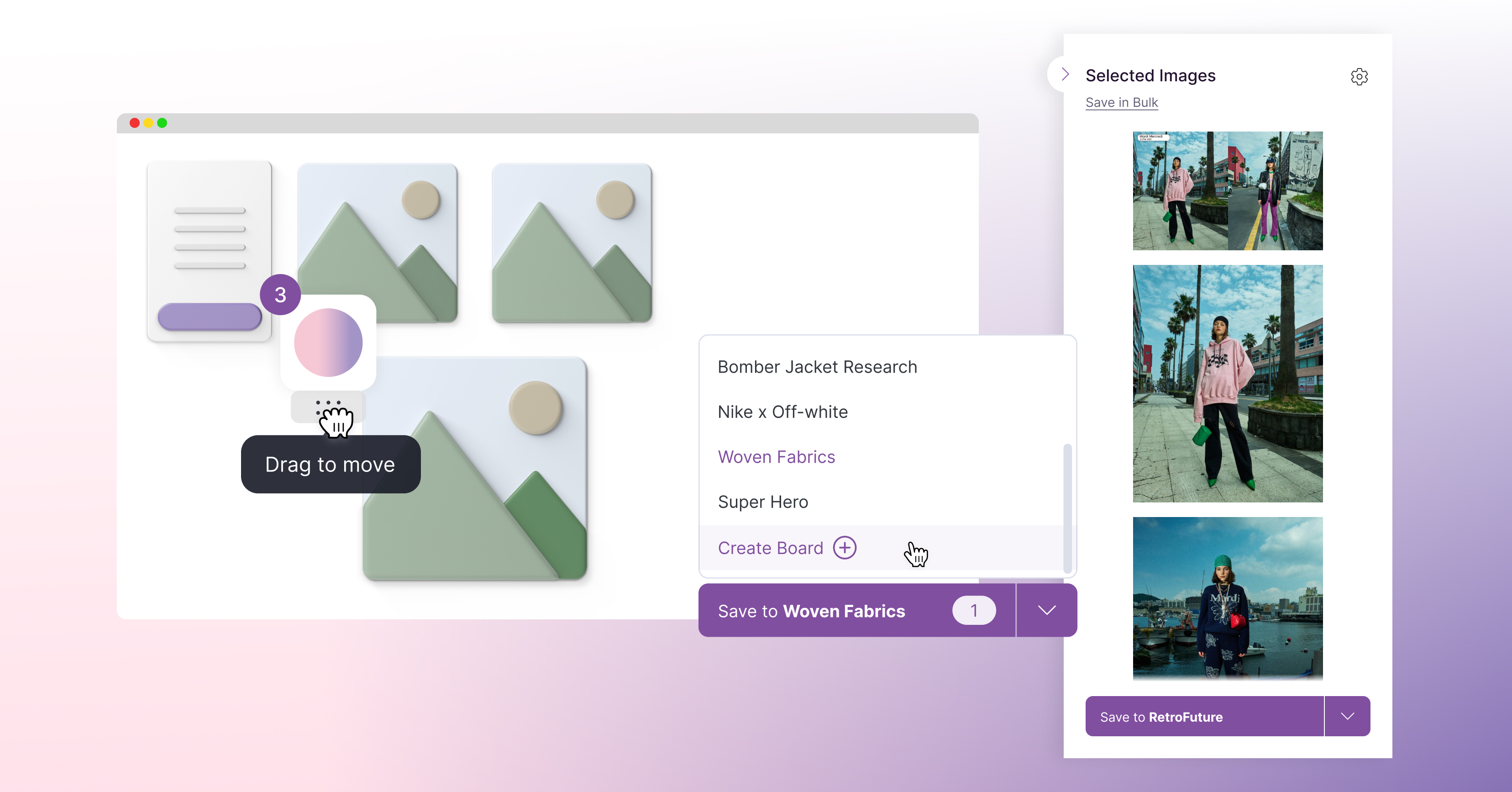 - When you collapse the side panel, you can now drag the icon around as you continue to select images across web pages. This will provide more flexibility when you save references at scale.